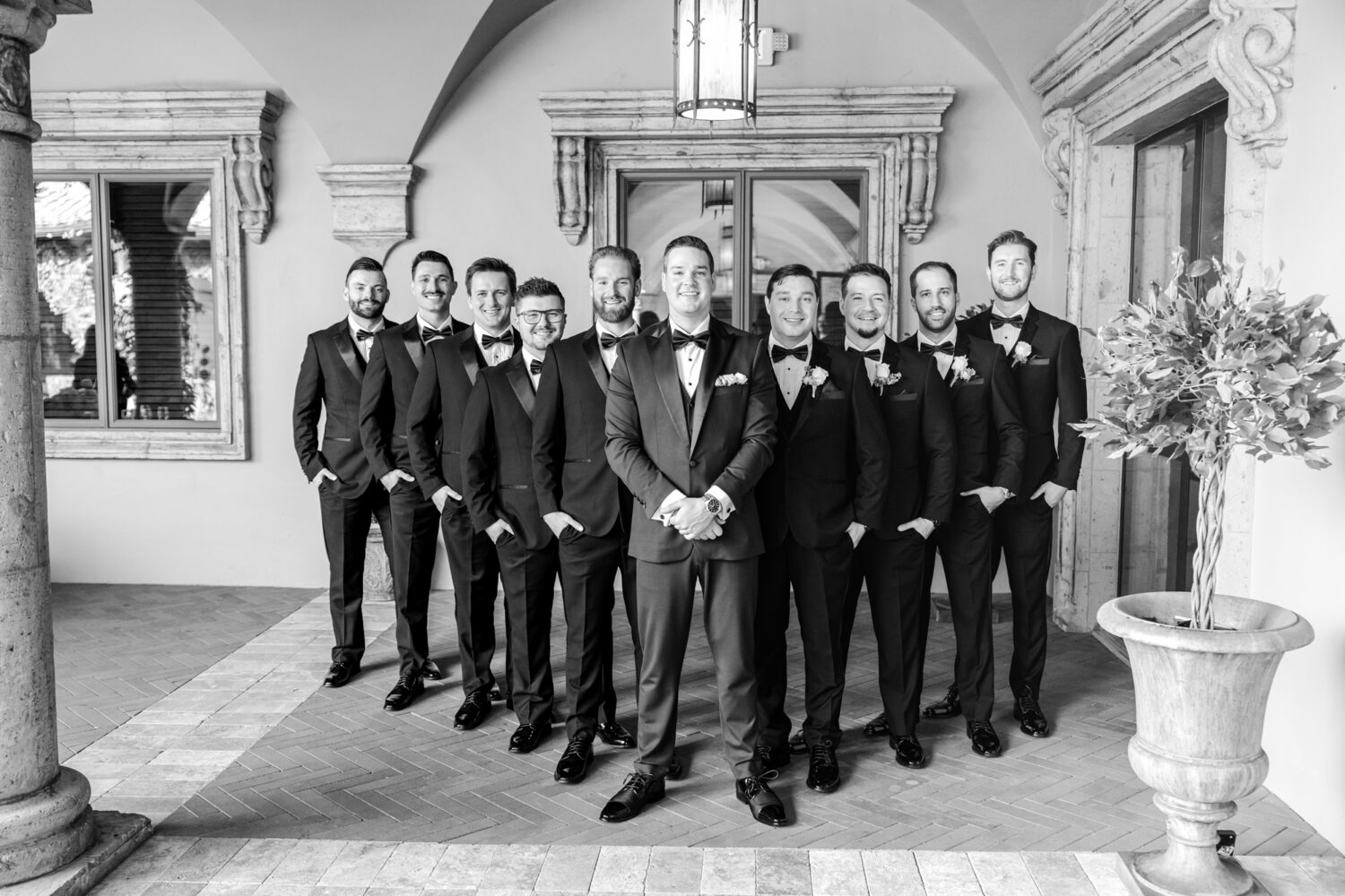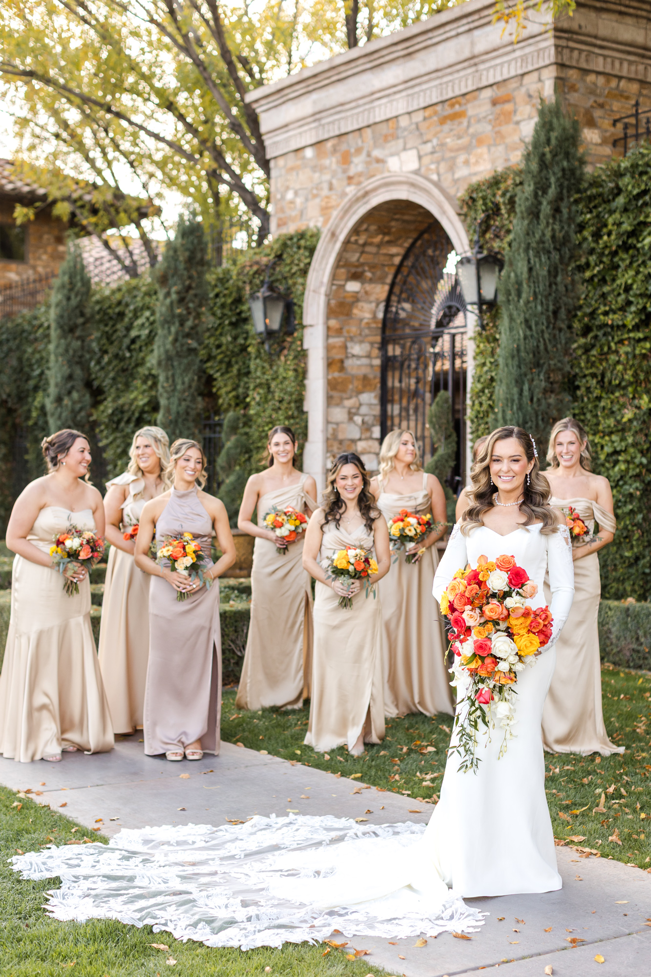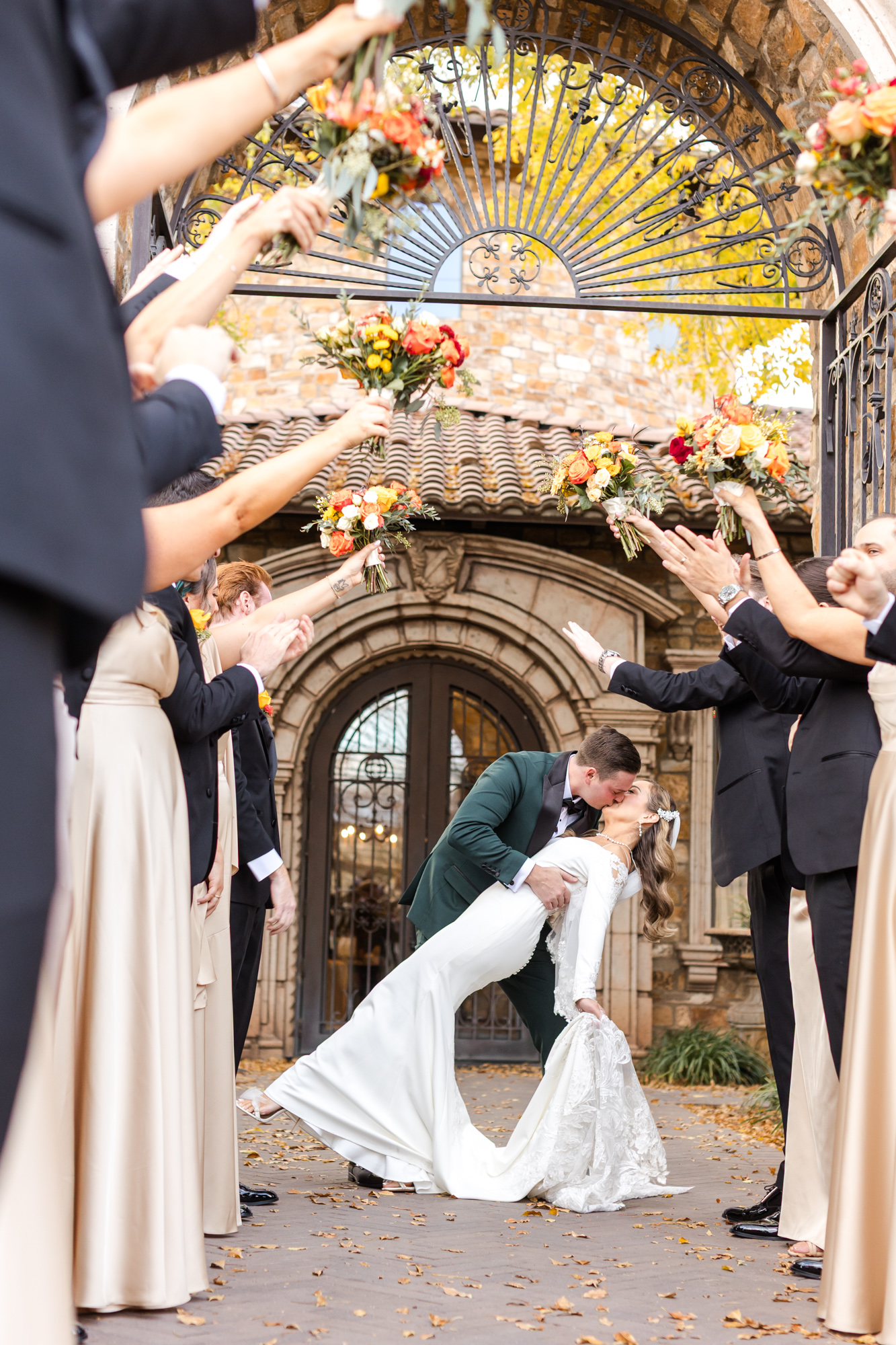 First, let’s talk about the style. John loves the color green – and yes, it matches his eyes perfectly – so he wore a bold green tux. It looked incredible. The bridesmaids wore champagne dresses, and the groomsmen wore classic black. Together, the black, gold, and green palette felt stunning and timeless. The Tuscan feel of Villa Siena, paired with the greenery and fountains, created the dreamiest backdrop for both the ceremony and reception.